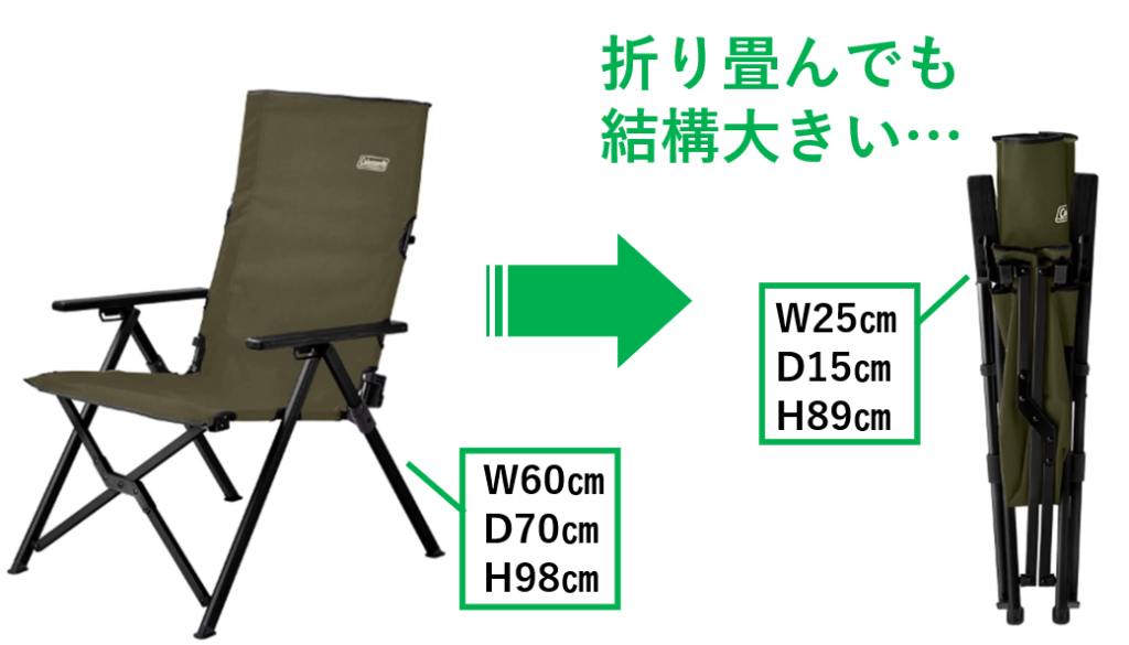 折り畳みは便利な収束型ですが、ハイバックゆえに収納サイズが大きいのが玉にキズ。